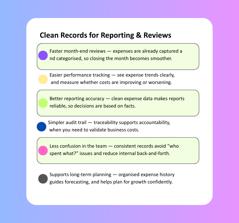 Keep expense records organised and traceable so reporting and reviews become easy.