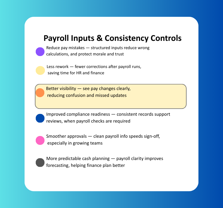 Keep payroll inputs consistent so staff pay stays correct and predictable.
