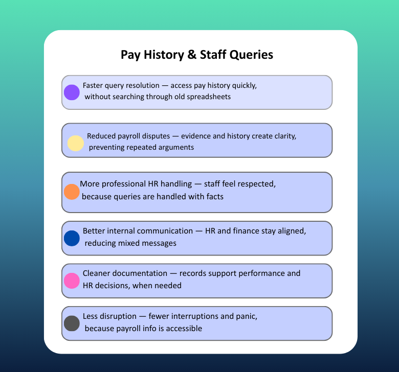Keep pay history visible so staff queries are resolved quickly and professionally
