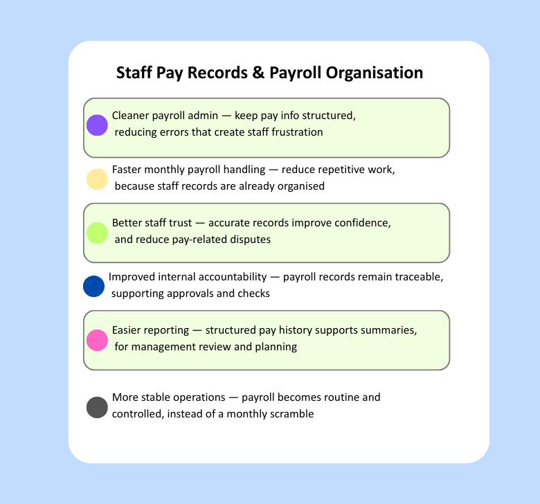 Keep staff pay records, payroll support information, and pay-related admin structured—so finance stays accurate and staff trust stays high.