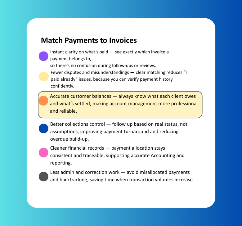 Link every payment to the correct invoice so your records stay clean and customer balances stay accurate.